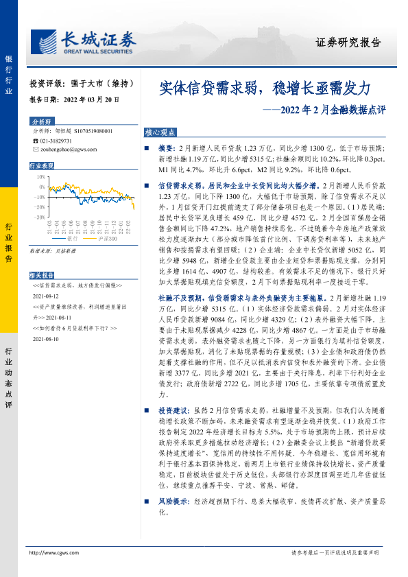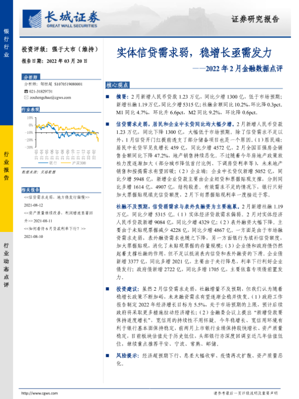 【长城证券】【20220320】银行行业2022年2月金融数据点评:实体信贷需求弱,稳增长亟需发力-5页