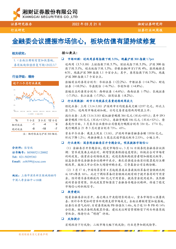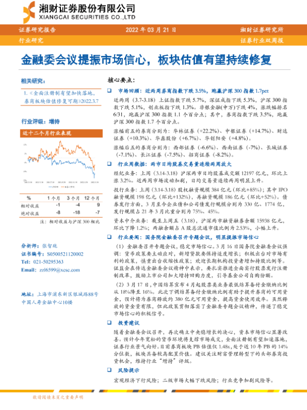 【湘财证券】【20220321】证券行业双周报:金融委会议提振市场信心,板块估值有望持续修复-10页