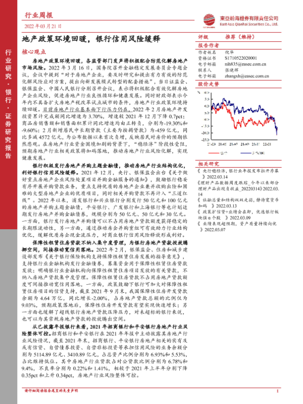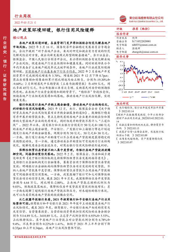 【东亚前海证券】【20220321】银行行业周报:地产政策环境回暖,银行信用风险缓释-17页