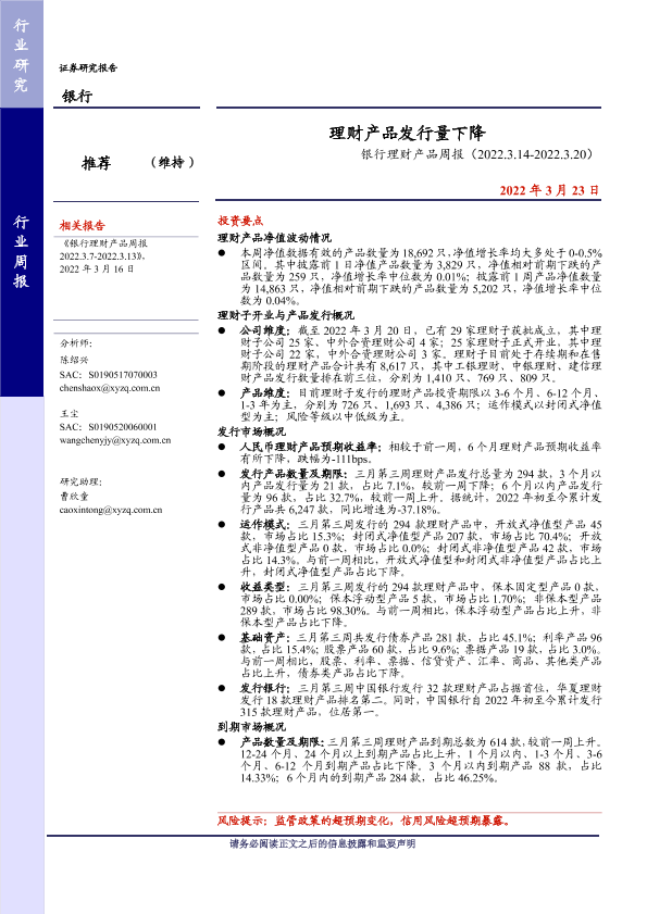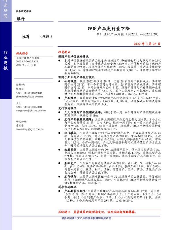 【兴业证券】【20220323】银行理财产品周报:理财产品发行量下降-20页