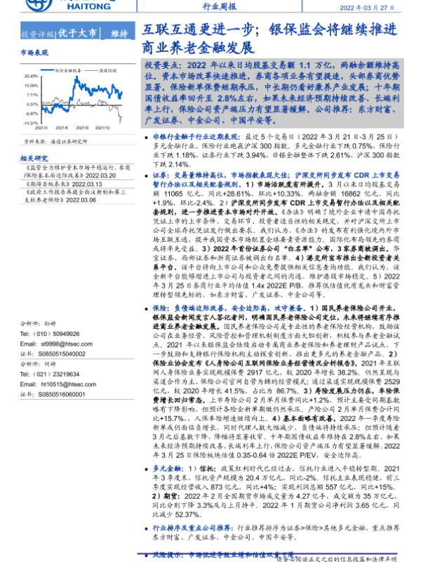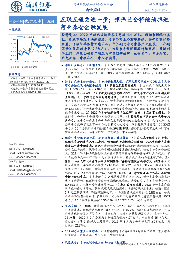 【海通证券】【20220327】综合金融服务行业周报:互联互通更进一步;银保监会将继续推进商业养老金融发展-11页