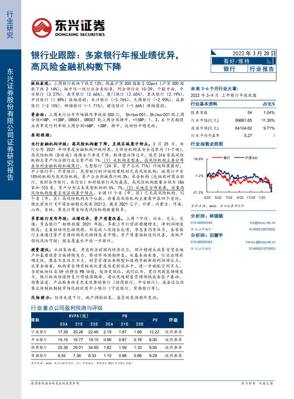 【东兴证券】【20220328】银行业跟踪:多家银行年报业绩优异,高风险金融机构数下降-9页