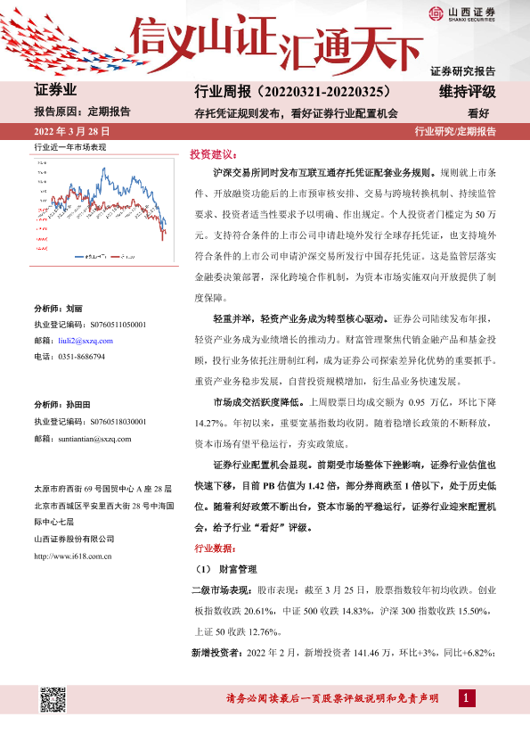 【山西证券】【20220328】证券业行业周报:存托凭证规则发布,看好证券行业配置机会-10页