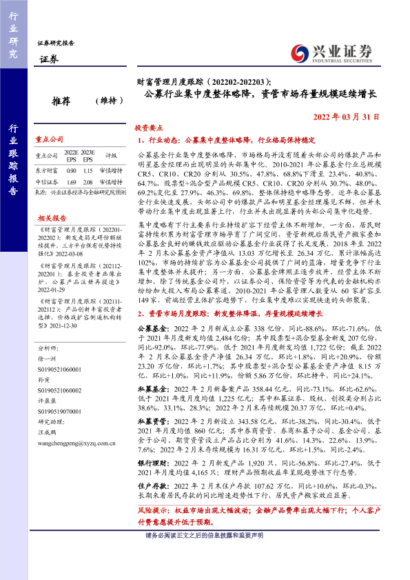 【兴业证券】【20220331】财富管理月度跟踪:公募行业集中度整体略降,资管市场存量规模延续增长-15页