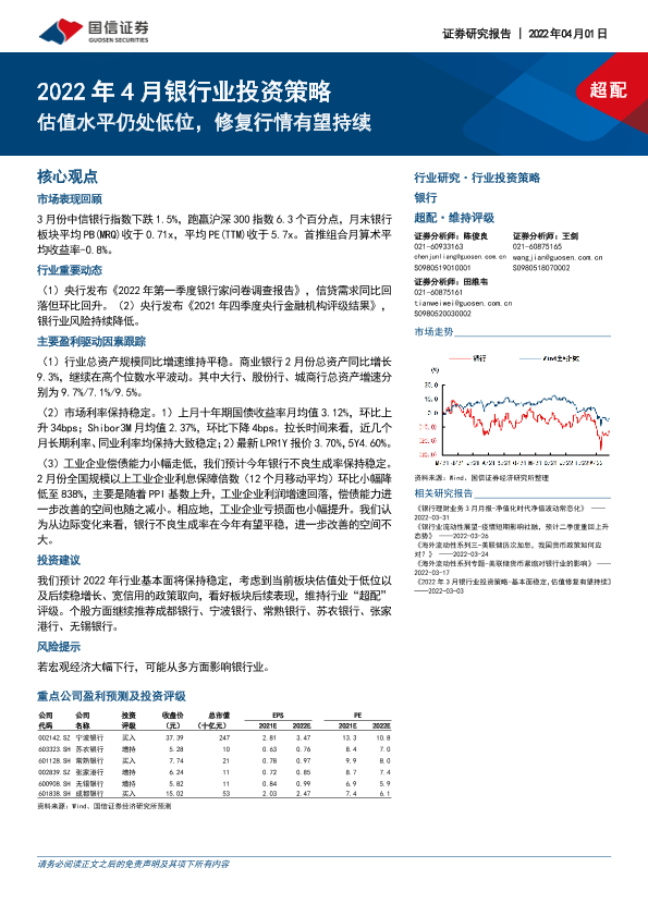 【国信证券】【20220401】2022年4月银行业投资策略:估值水平仍处低位,修复行情有望持续-8页