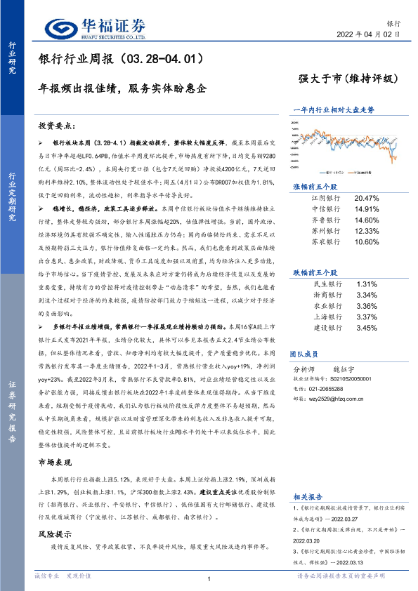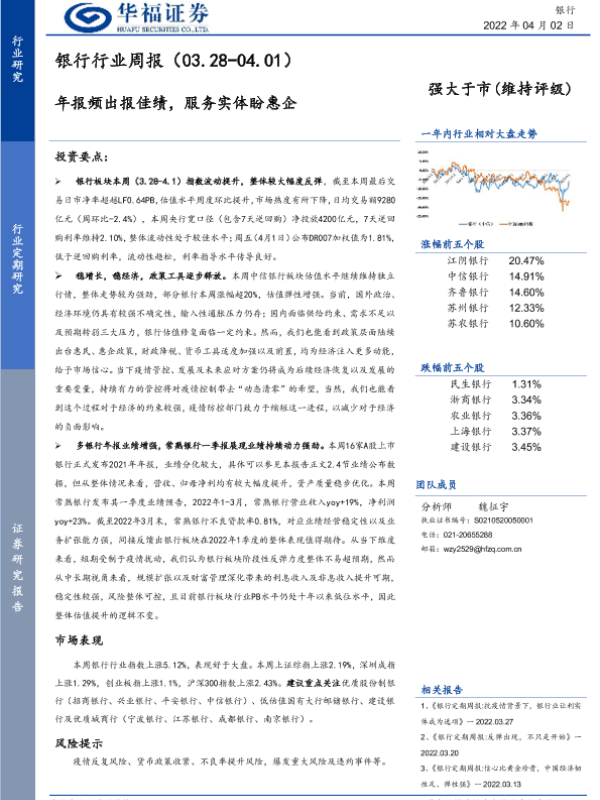 【华福证券】【20220402】银行行业周报:年报频出报佳绩,服务实体盼惠企-15页