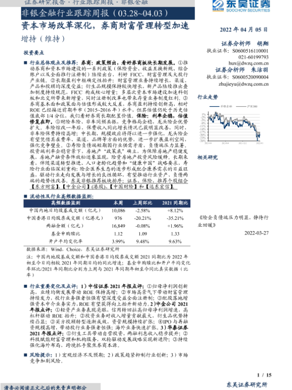 【东吴证券】【20220405】非银金融行业跟踪周报:资本市场改革深化,券商财富管理转型加速-15页