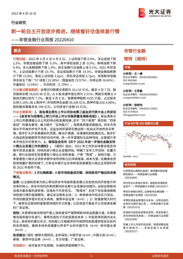【光大证券】【20220410】非银金融行业周报:新一轮自主开放逐步推进,继续看好估值修复行情-7页