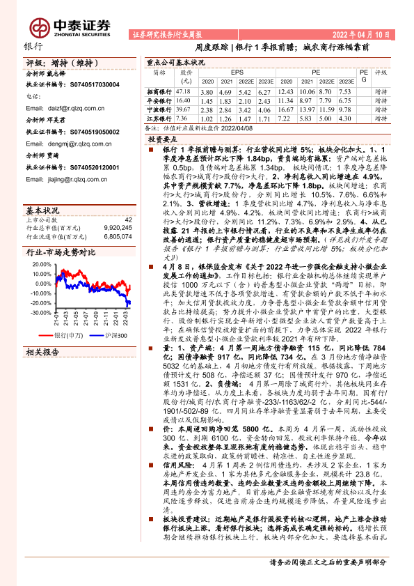 【中泰证券】【20220410】银行周度跟踪:银行1季报前瞻;城农商行涨幅靠前-18页