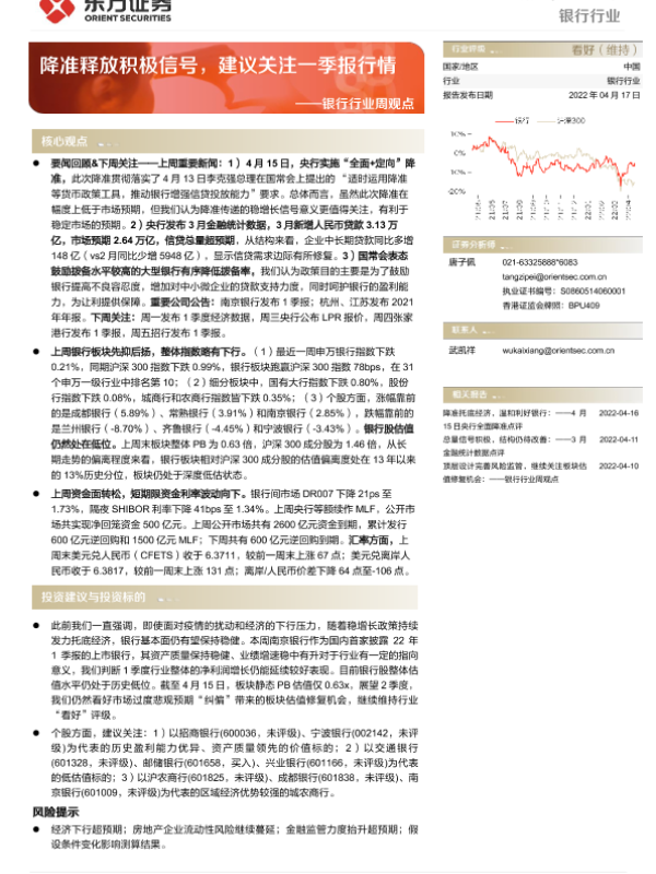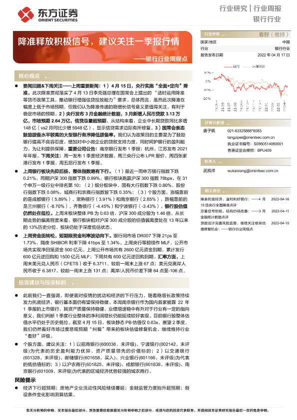 【东方证券】【20220417】银行行业周观点:降准释放积极信号,建议关注一季报行情-15页
