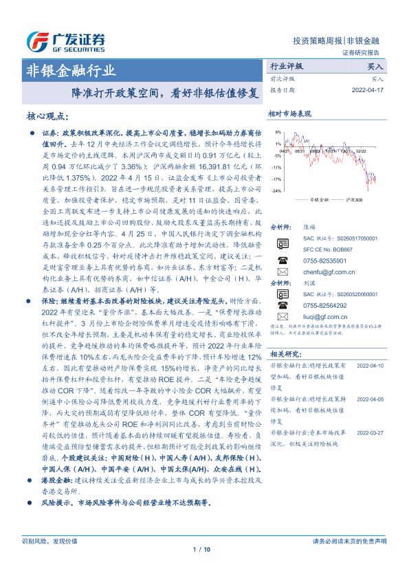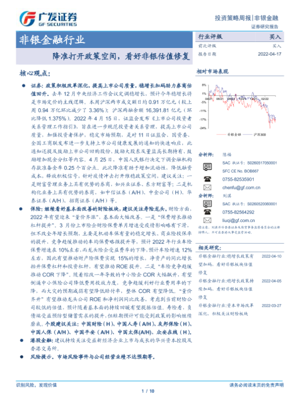 【广发证券】【20220417】非银金融行业投资策略周报:降准打开政策空间,看好非银估值修复-10页