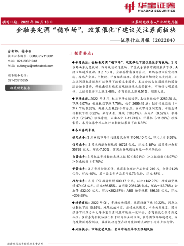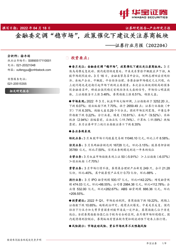 【华宝证券】【20220418】证券行业月报:金融委定调“稳市场”,政策催化下建议关注券商板块-9页