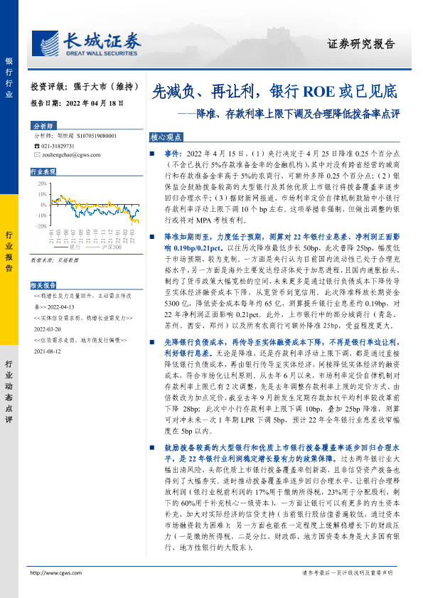 【长城证券】【20220418】降准、存款利率上限下调及合理降低拨备率点评:先减负、再让利,银行ROE或已见底-3页