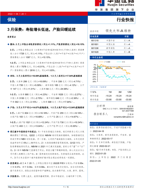 【华金证券】【20220420】3月保费:寿险增长低迷,产险回暖延续-5页