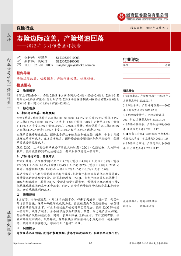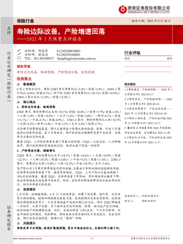 【浙商证券】【20220420】2022年3月保费点评报告:寿险边际改善,产险增速回落-3页