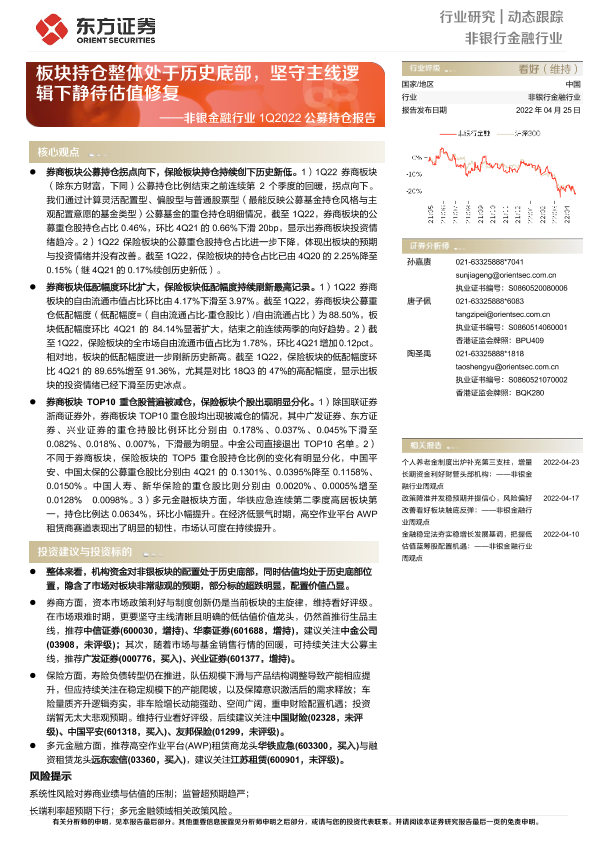 【东方证券】【20220425】非银金融行业1Q2022公募持仓报告:板块持仓整体处于历史底部,坚守主线逻辑下静待估值修复-5页