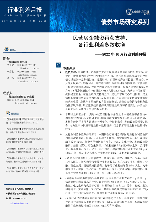 【中诚信国际】【20221031】中诚信-【行业利差月报】民营房企融资再获支持,各行业利差多数收窄(2022年10月)-14页