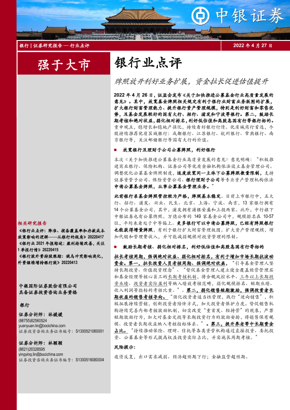 【中银证券】【20220427】银行业点评:牌照放开利好业务扩展,资金拉长促进估值提升-6页