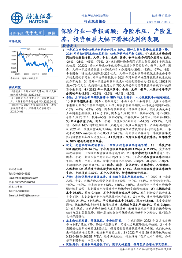 【海通证券】【20220430】保险行业一季报回顾:寿险承压、产险复苏,投资收益大幅下滑拉低利润表现-10页