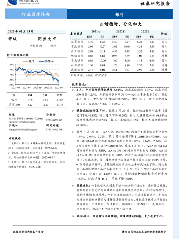【财信证券】【20220505】银行行业月度报告:业绩稳增,分化加大-10页