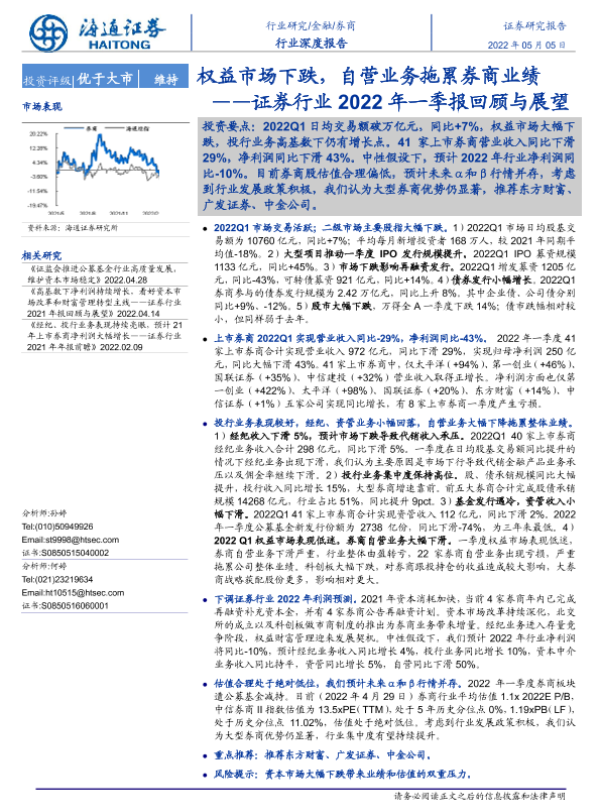 【海通证券】【20220505】证券行业2022年一季报回顾与展望:权益市场下跌,自营业务拖累券商业绩-27页