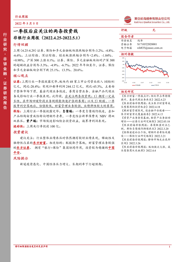 【东亚前海证券】【20220505】非银行业周报:一季报后应关注的两条投资线-11页