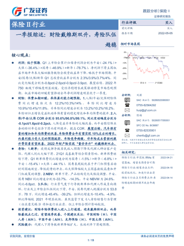【广发证券】【20220505】保险Ⅱ行业一季报综述:财险戴维斯双升,寿险队伍趋稳-13页