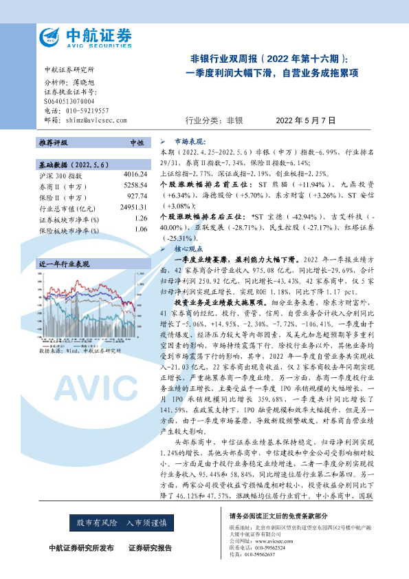 【中航证券】【20220507】非银行业双周报:一季度利润大幅下滑,自营业务成拖累项-10页