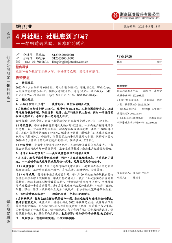 【浙商证券】【20220513】4月社融:社融底到了吗?——黎明前的黑暗,困难时的曙光-5页