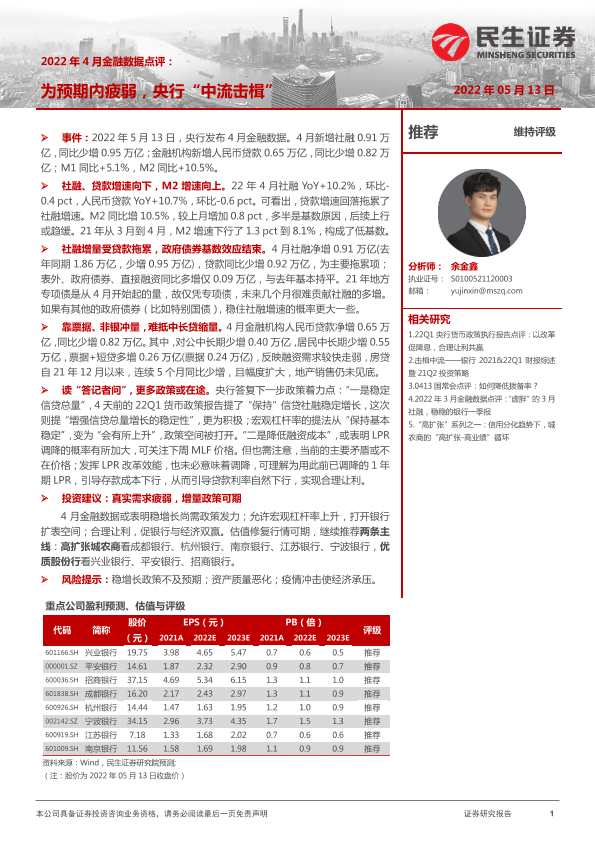 【民生证券】【20220513】2022年4月金融数据点评:为预期内疲弱,央行“中流击楫”-5页