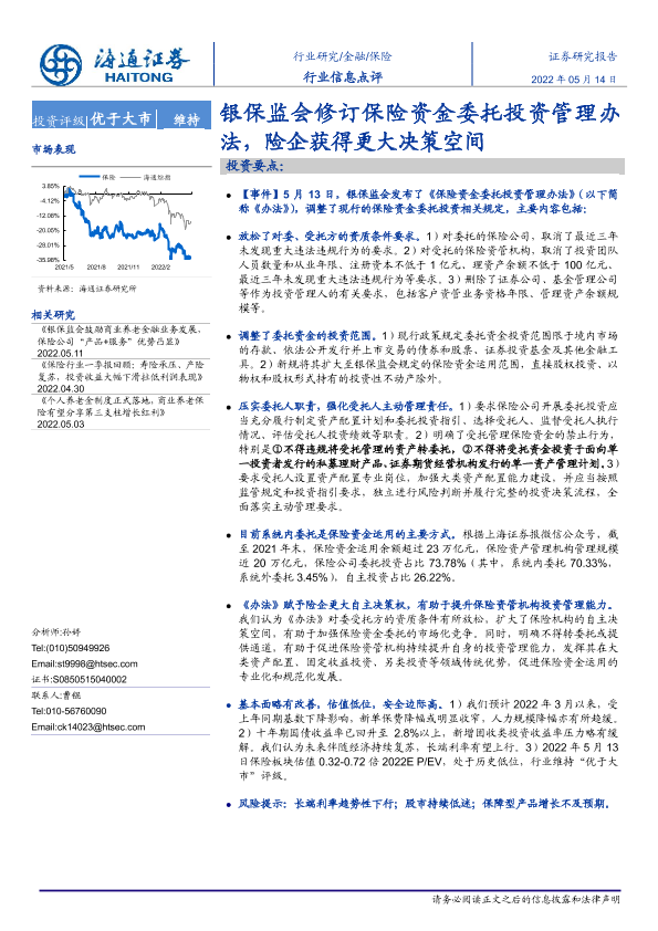 【海通证券】【20220514】银保监会修订保险资金委托投资管理办法,险企获得更大决策空间-4页
