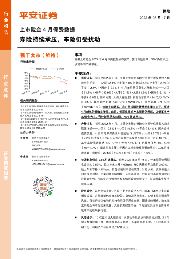 【平安证券】【20220517】上市险企4月保费数据:寿险持续承压,车险仍受扰动-3页