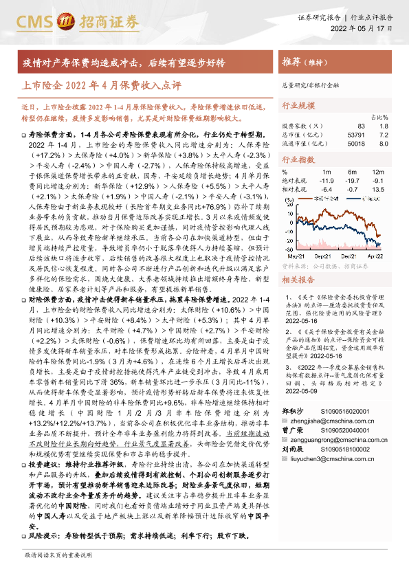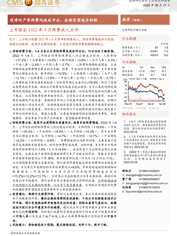【海通证券】【20220517】非银行金融上市险企2022年4月保费收入点评-2页