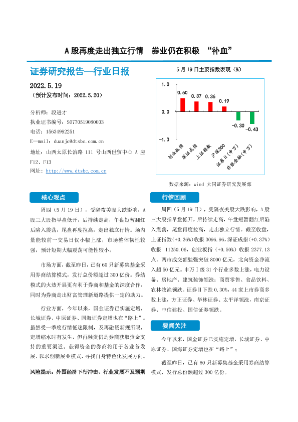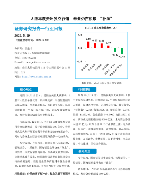 【大同证券】【20220519】非银金融行业日报:A股再度走出独立行情 券业仍在积极“补血”-10页