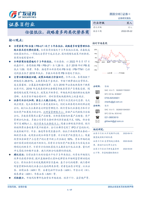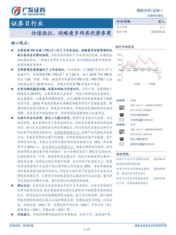 【广发证券】【20220522】证券Ⅱ行业:估值低位,战略看多两类优势券商-17页