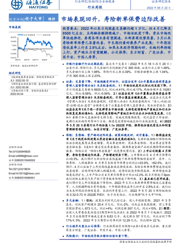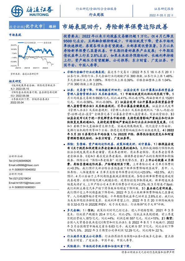【海通证券】【20220522】综合金融服务行业周报:市场表现回升,寿险新单保费边际改善-11页