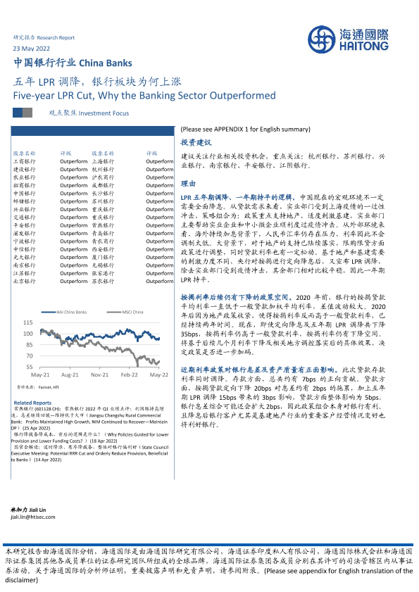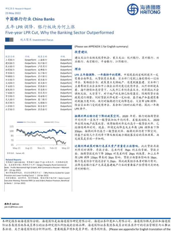 【海通国际】【20220523】中国银行行业:五年LPR调降,银行板块为何上涨-13页
