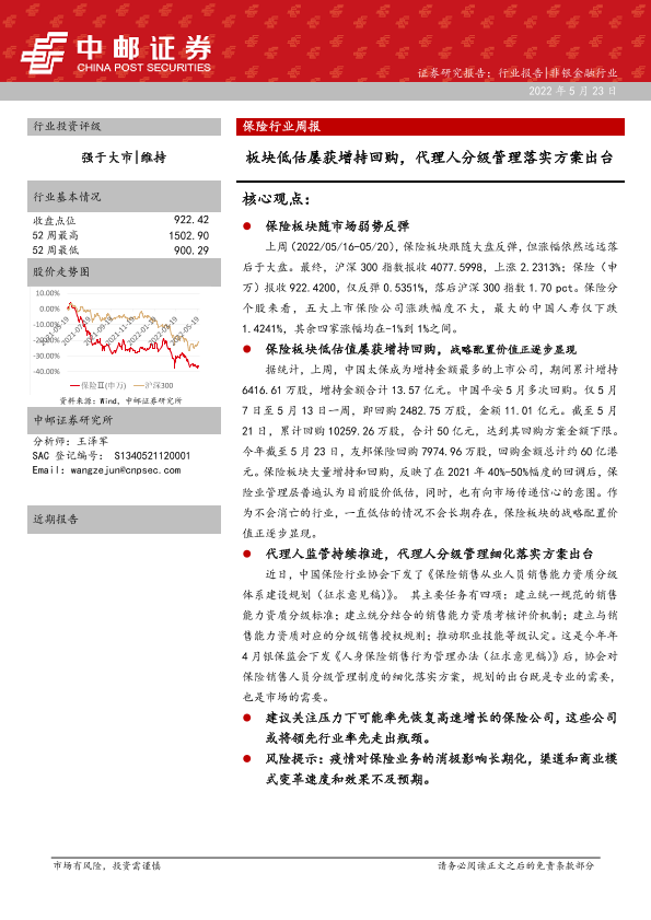 【中邮证券】【20220523】保险行业周报:板块低估屡获增持回购,代理人分级管理落实方案出台-18页