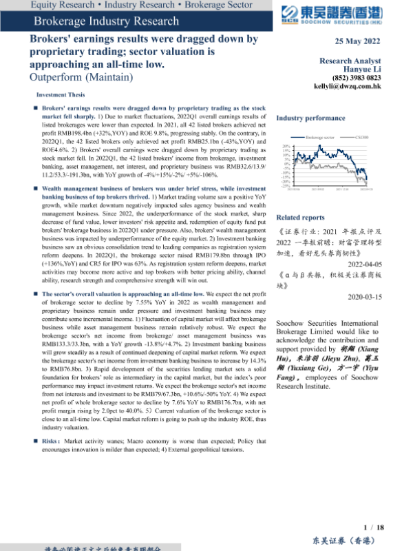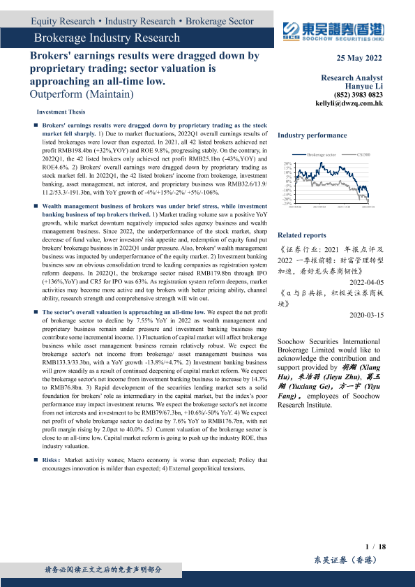 【东吴证券(香港)】【20220525】证券Ⅱ行业点评报告:自营拖累业绩,估值逼近历史底部-18页