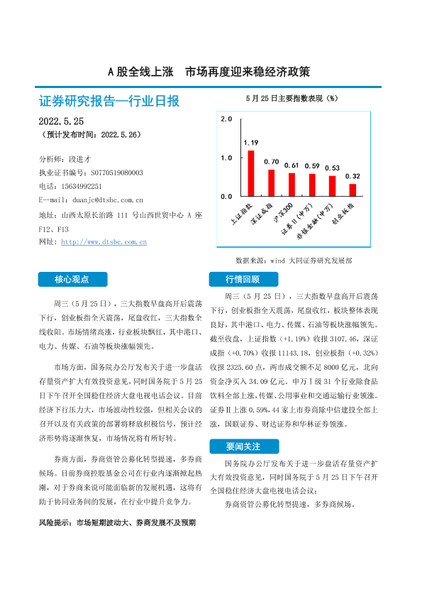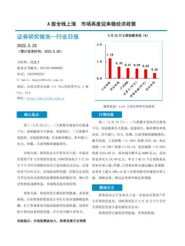 【大同证券】【20220525】非银金融行业日报:A股全线上涨 市场再度迎来稳经济政策-10页