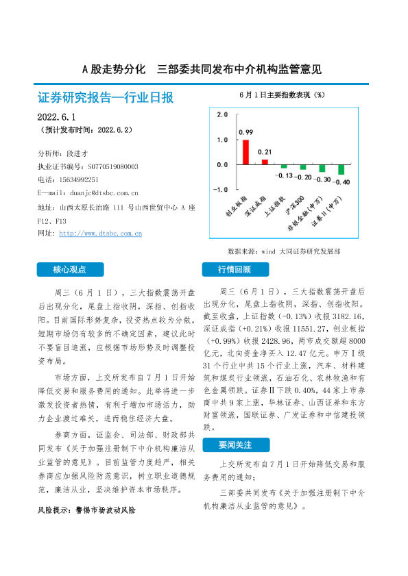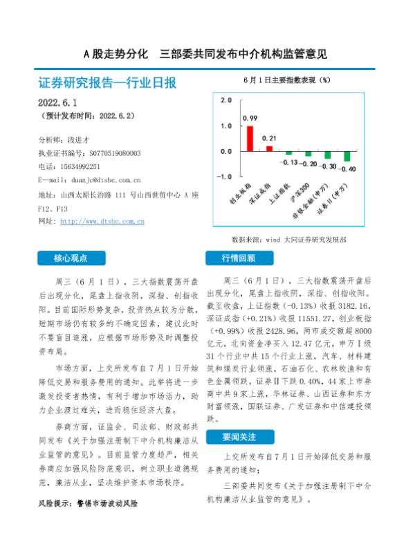 【大同证券】【20220601】非银金融行业日报:A股走势分化 三部委共同发布中介机构监管意见-10页