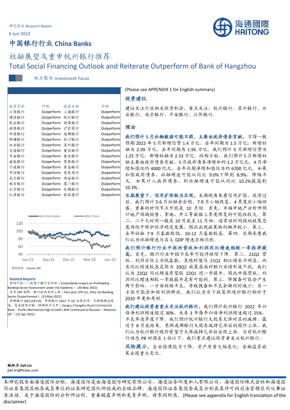 【海通国际】【20220606】中国银行行业:社融展望及重申杭州银行推荐-10页