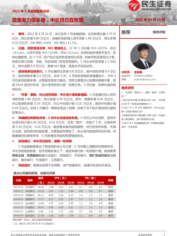 【民生证券】【20220610】2022年5月金融数据点评:政策发力促多增,中长贷已在恢复-4页