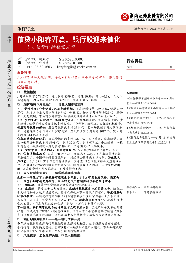 【浙商证券】【20220611】5月信贷社融数据点评-信贷小阳春开启,银行股迎来催化-6页