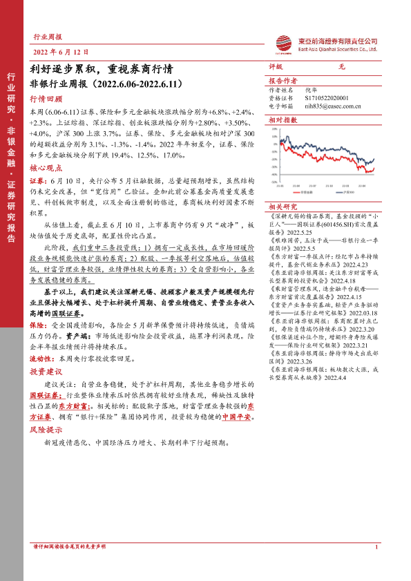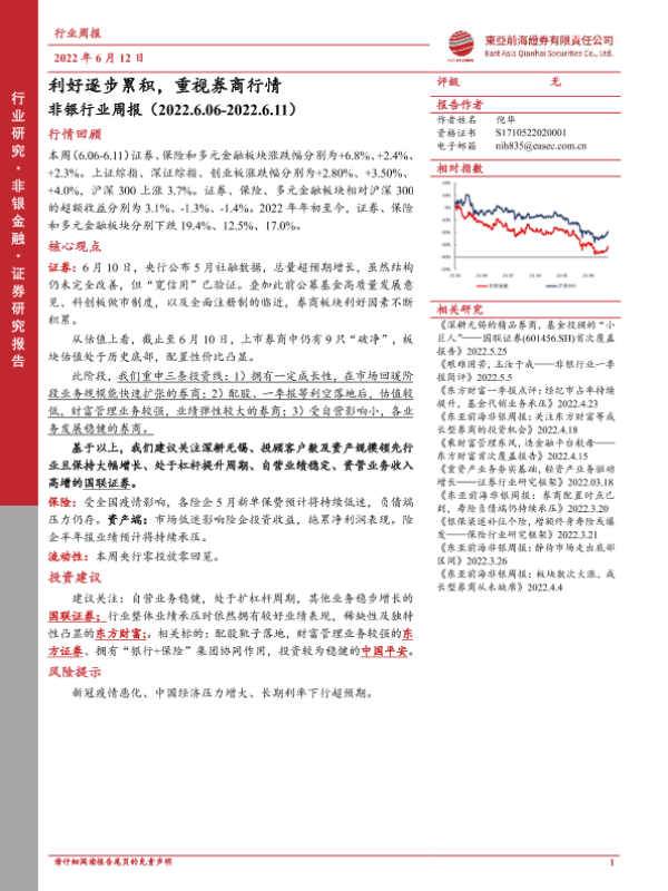 【东亚前海证券】【20220612】非银行业周报:利好逐步累积,重视券商行情-9页