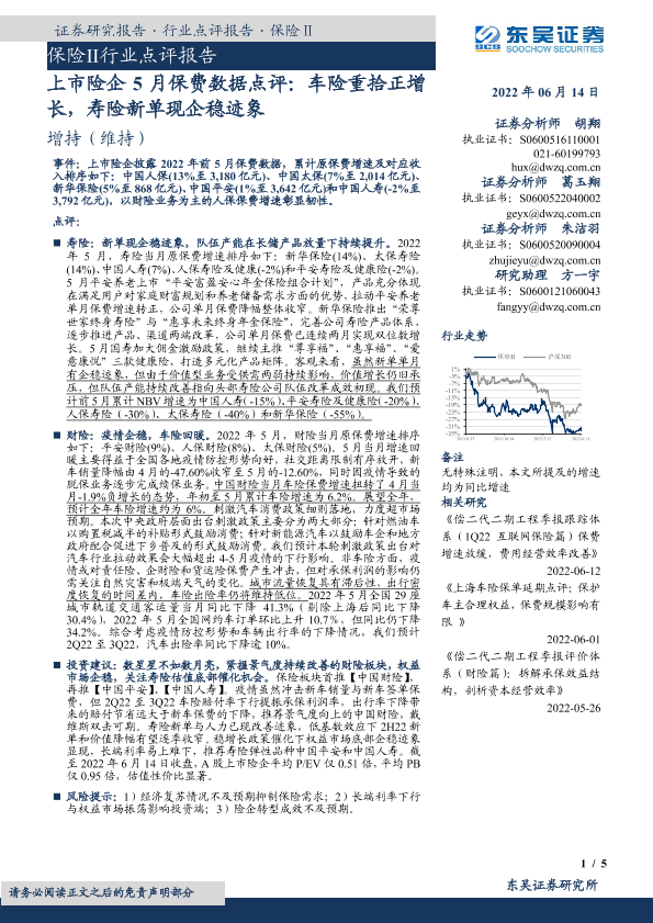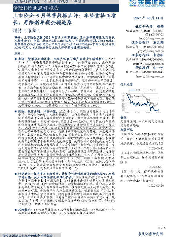 【东吴证券】【20220614】上市险企5月保费数据点评:车险重拾正增长,寿险新单现企稳迹象-5页