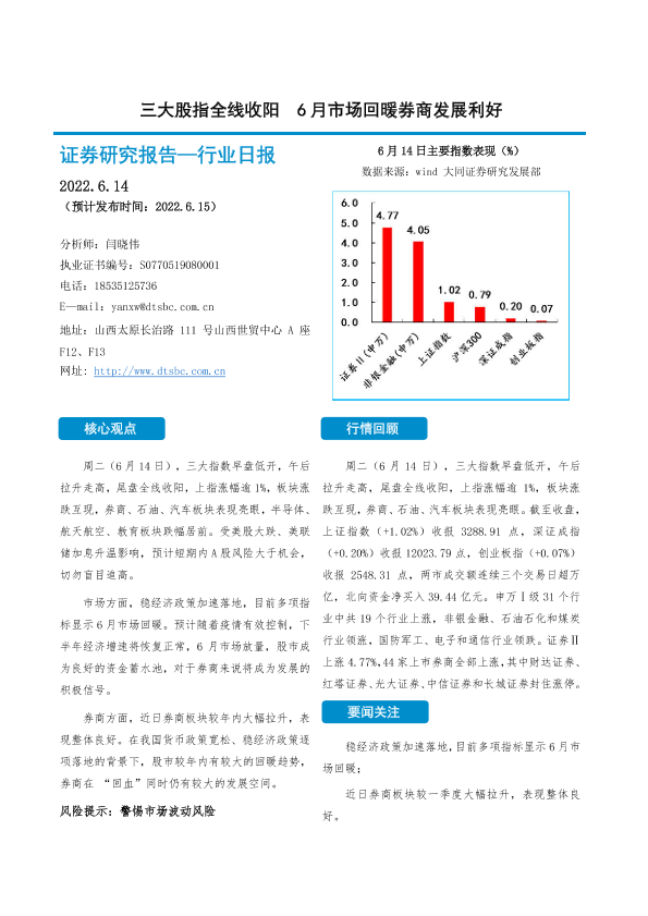 【大同证券】【20220614】非银金融行业日报:三大股指全线收阳 6月市场回暖券商发展利好-10页