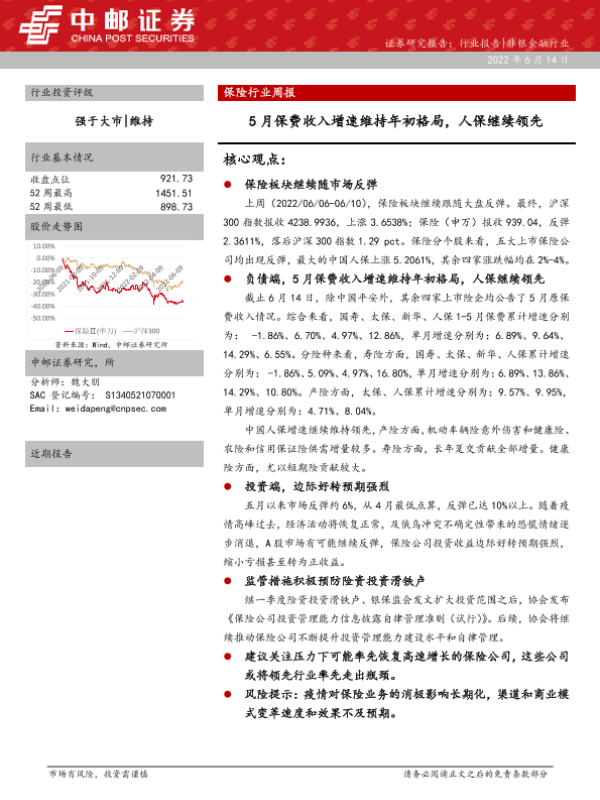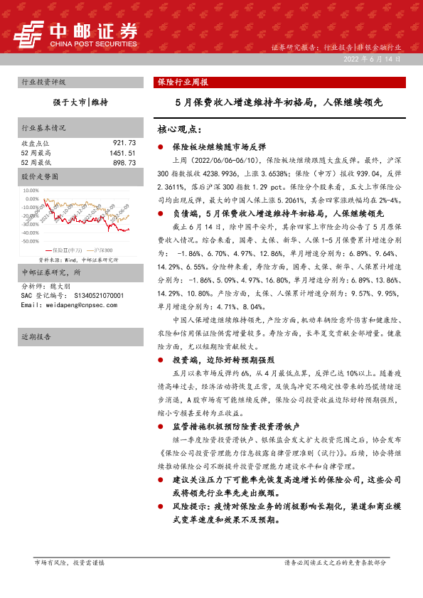 【中邮证券】【20220614】保险行业周报:5月保费收入增速维持年初格局,人保继续领先-17页