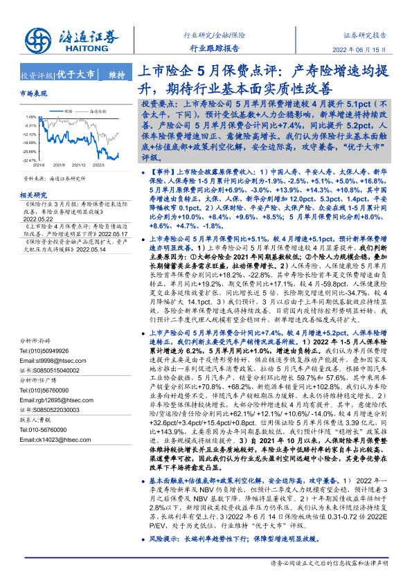 【海通证券】【20220615】上市险企5月保费点评:产寿险增速均提升,期待行业基本面实质性改善-5页