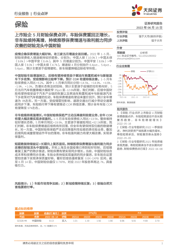 【天风证券】【20220615】上市险企5月财险保费点评:车险保费重回正增长,非车险维持高增-2页